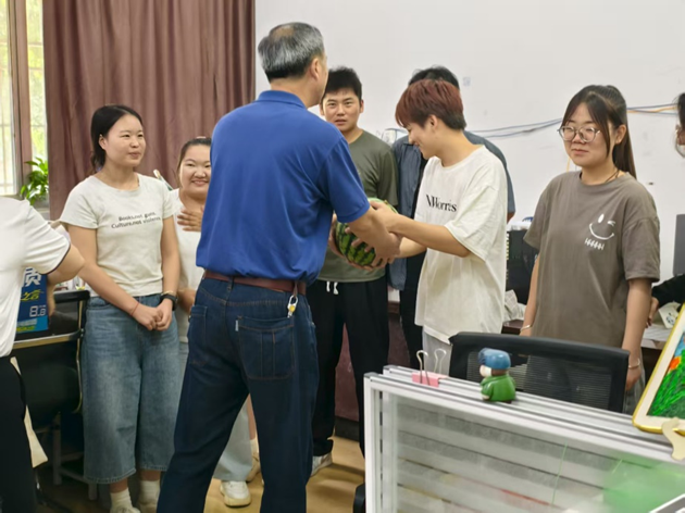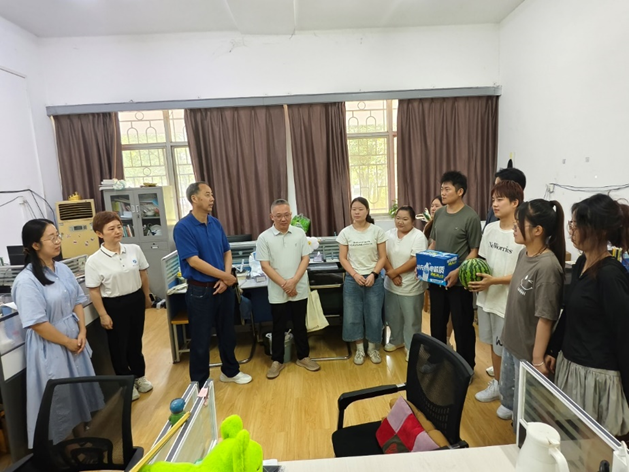 在研究生工作室,学院党委书记江本武对留校研究生投身科研项目的钻研精神给予高度肯定,现场为同学们送上西瓜、饮料等消暑物资。他叮嘱同学们在努力学习的同时,务必遵守学校暑期留校管理规定,强化安全防范意识,注意交通、人身及财产安全。他表示,学校学院将全力为留校学生提供良好的学习和生活保障。