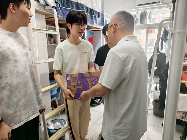 走访中,院长何东升走进学生宿舍,亲切地询问复习备考学生的考研规划、目标院校选择,鼓励大家:“暑期是学业攻坚的黄金期,要科学规划日程,既保持冲刺劲头,也要注重劳逸结合,学院全体导师会为大家提供精准指导。”