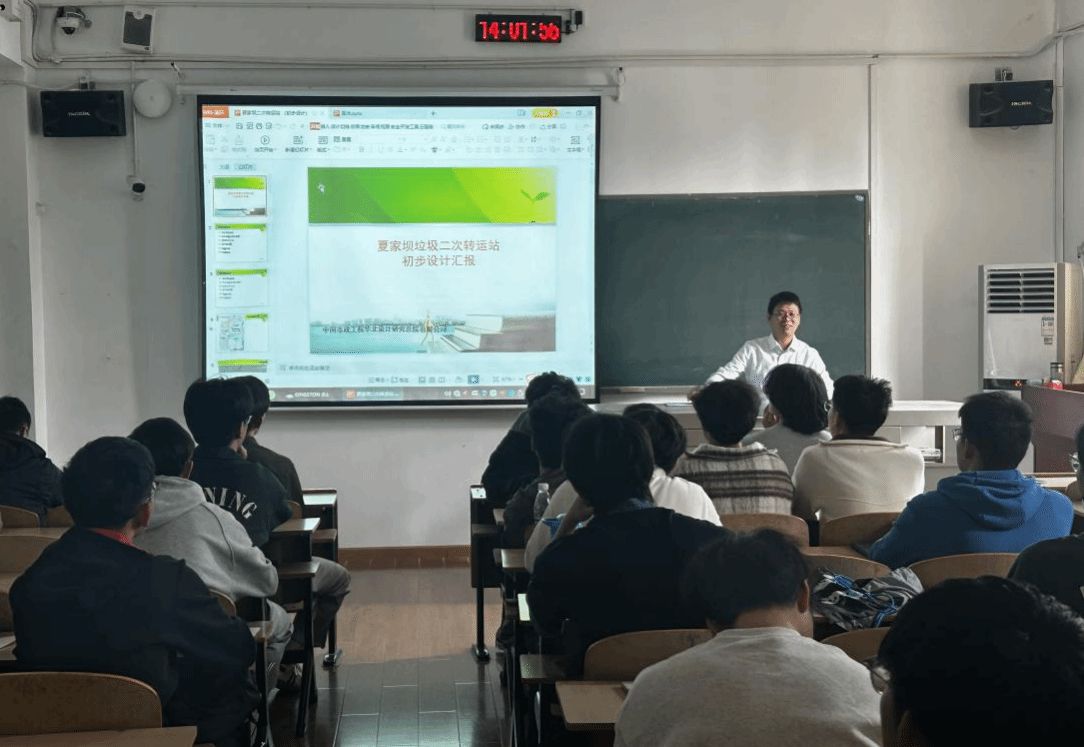 校企合作课程《矿物材料》的最后一堂课在二教2508成功举行。根据课程教学安排,本次特邀中铁十一局第五工程有限公司高级工程师黄斯铭走进课堂,以“夏家坝垃圾二次转运站”这一大型市政工程为鲜活案例,为同学们带来了一场连接理论知识与工程实践的深度讲座。