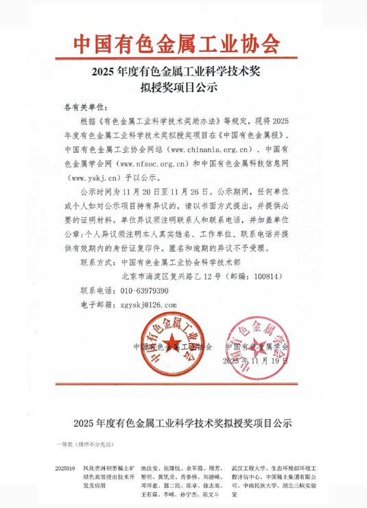 在稀土湿法冶金领域的技术实力再上台阶。有色金属工业科学技术奖是经国家科学技术奖励工作办公室批准设立的有色金属行业唯一全国性科技奖项,代表我国有色金属行业科技领域的最高荣誉。