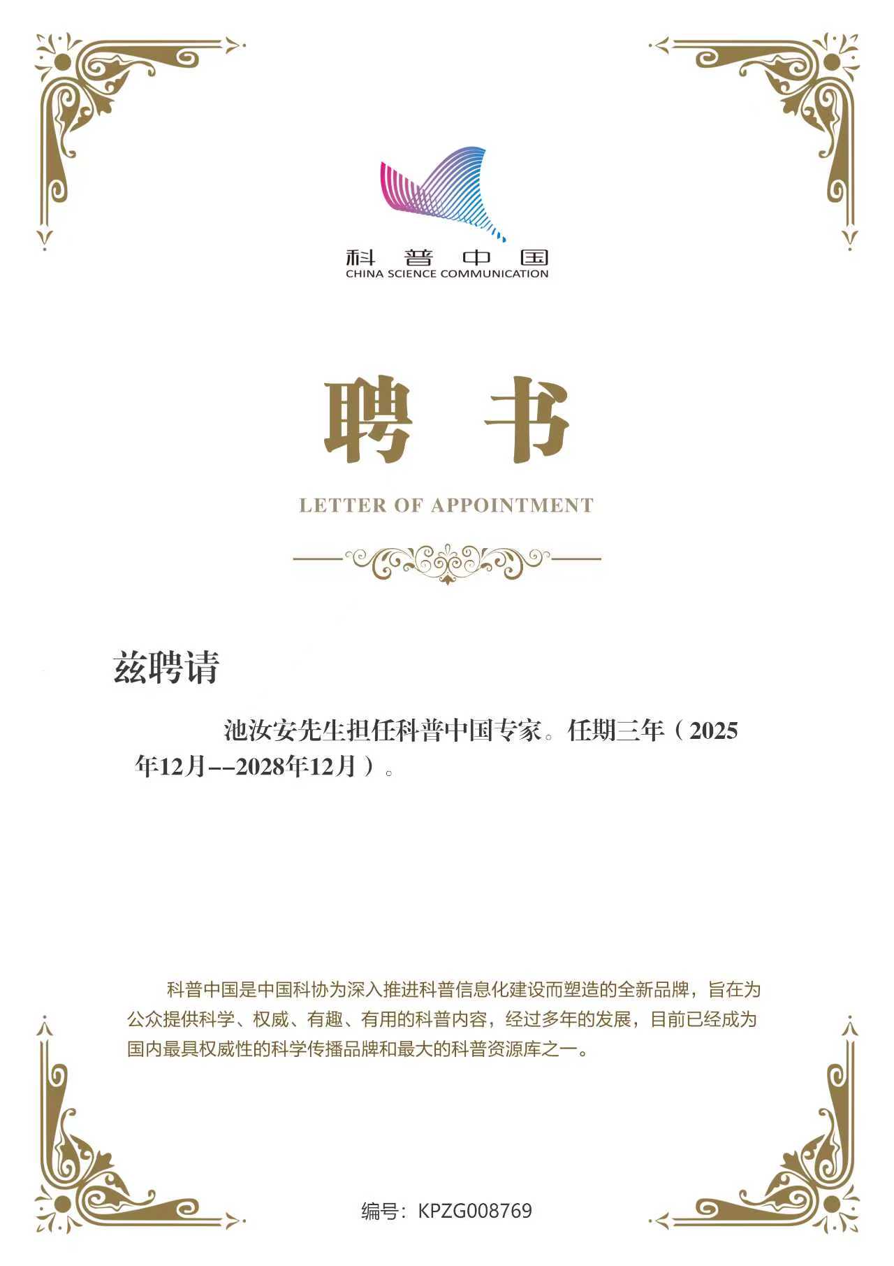 (通讯员:周芳、孙宁杰)在科学与公众之间架设桥梁,让深奥的专业知识化为滋养社会的清泉,是时代赋予科技工作者的重要使命。近日,经严格评审与遴选,浪live 池汝安教授正式受聘为国家级权威科普平台“科普中国专家”。这不仅是对池汝安教授在稀土矿物加工领域卓越学术造诣与卓著科普贡献的权威认定,更标志着浪live 在科普工作方面所具备的深厚实力与广泛影响力。