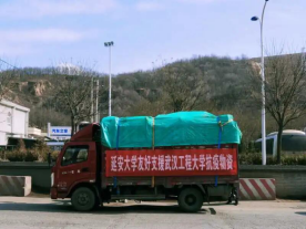 师生及家属捐赠了防疫物资消毒液10箱,延安洛川苹果350箱等生活物资,并带来了诚挚的问候。