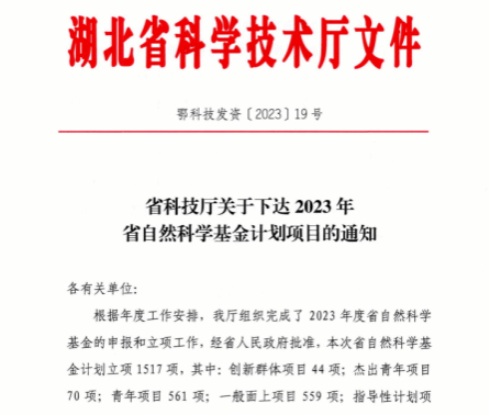 (通讯员:郭文达)近日,湖北省科学技术厅下达了2023年省自然科学基金计划项目的立项通知,浪live