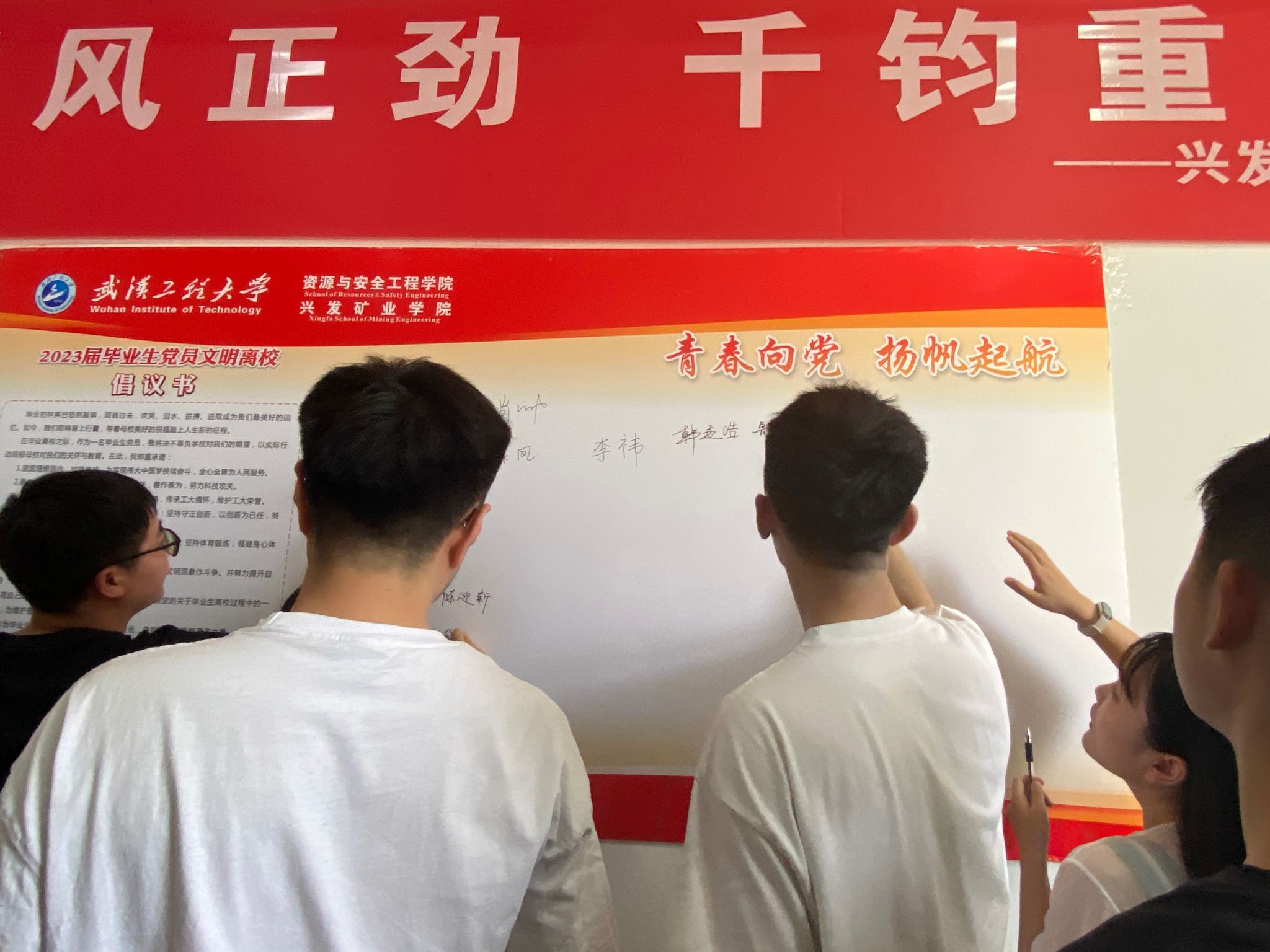 签署离校承诺,发挥模范作用。学院组织毕业生党员集体签署《2023届毕业生党员文明离校倡议书》。本科生第四党支部副书记陈锦辉、研究生党员张帅分别做代表发言,纷纷感谢学校、学院的悉心培育和尽心关怀,表示自己将牢记“格物明理,致知笃行”的工大校训,努力在奋发有为中践行初心使命。