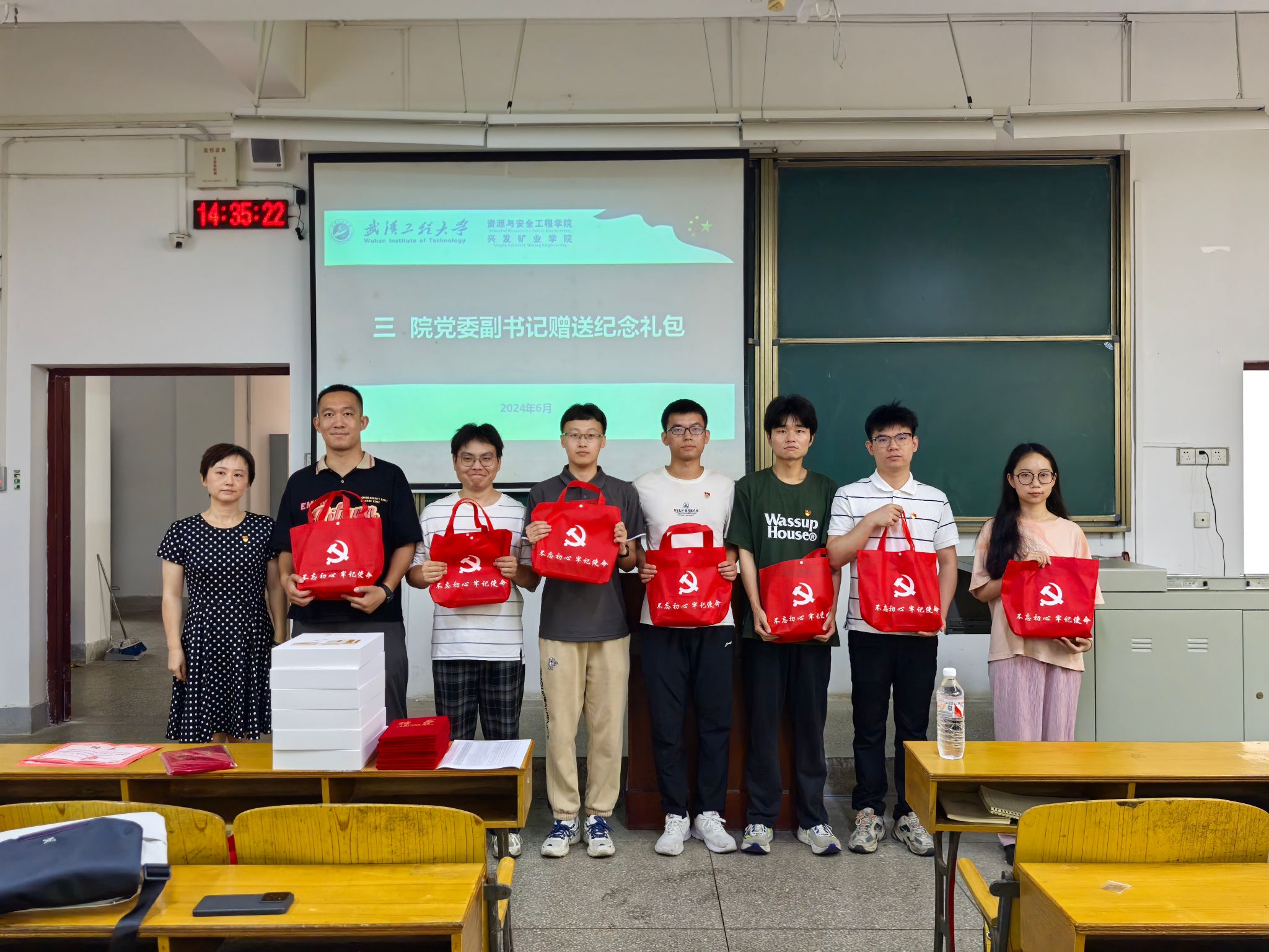 全体毕业生党员重温入党誓词,李佳为毕业生党员发放党员纪念礼包,内容包含一枚党徽、一本党章、一份《致毕业生党员的一封信》、一份纪念品、一个纪念袋。
