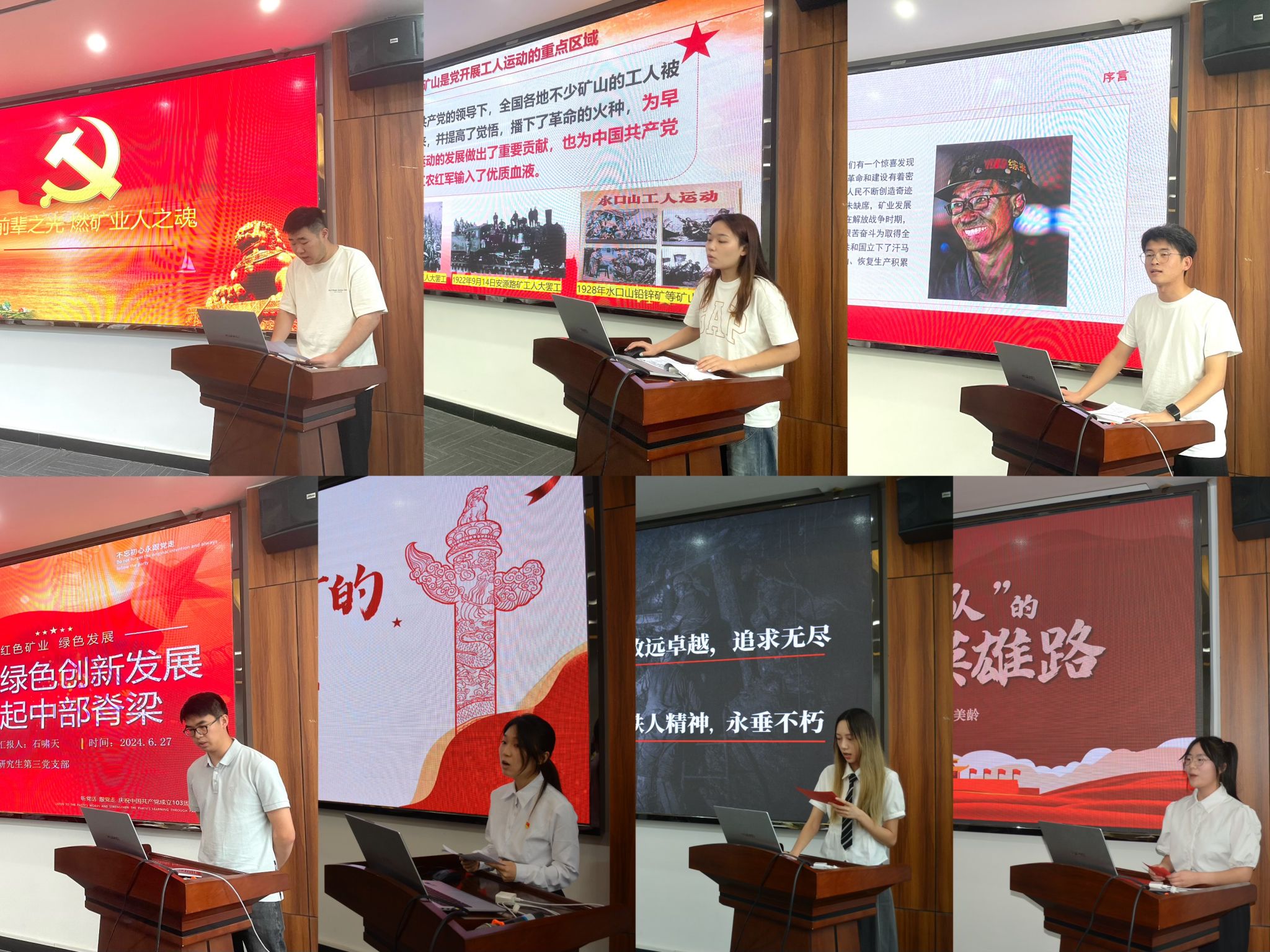 举办一场微党课比赛。学院举办了“红色矿业 绿色发展”主题微党课比赛,共有来自7个学生党支部的14名党员参赛,他们围绕功勋矿山的故事、矿业人的劳模精神、矿山的绿色转型发展历程等话题,以图文并茂的形式奉献了一场有滋有味、有声有色的精彩矿业史“微党课”,充分展现了作为矿业学子的专业素养和家国情怀。他们在比赛中号召要立志成为“知矿业、学矿业、爱矿业、干矿业”的新时代国家矿业接班人。