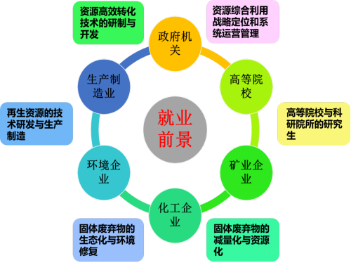 8.就业去向:本专业面向国家低碳经济、节能减排及资源综合利用等战略性新兴产业发展需要,以“资源”循环与综合利用为核心,培养满足社会发展需要的工程技术人才。毕业生可在政府、科研院所和企事业单位从事资源综合利用、固废资源化处置、再生资源回收与精深加工等工作,成长为具有卓越发展能力的高级工程技术与管理人才。