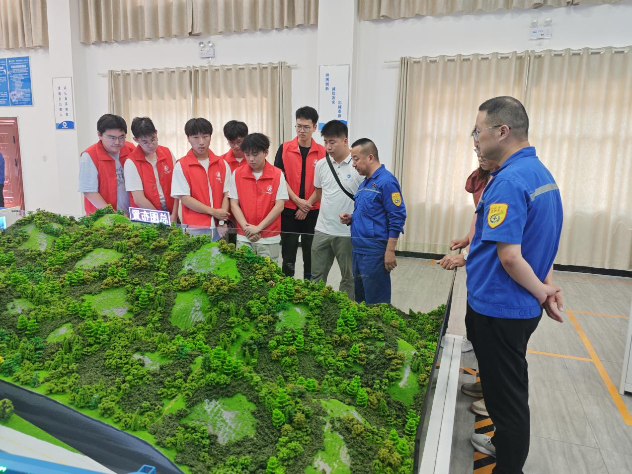 抵达矿井后,实践团随高安林步入企业智能监管中枢。一面巨幅监视屏如“矿山天眼”,实时映现井下人员轨迹与作业数据,中控人员依此精准调度,令千米之下的生产脉络清晰可辨。高安林的讲解深入浅出,从绿色开采的创新路径到安全设施的缜密布防,从资源高效利用的全局考量到科技赋能的实践细节,既彰显现代矿业“智控先行”的硬核实力,更流露企业对安全生产的敬畏与可持续发展的远思。这方中控室,恰是矿业从“人力驱动”向“智慧引领”转型的缩影,让成员对科技重塑传统产业有了鲜活认知。