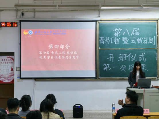 在热烈的掌声中,第七期“青马工程”优秀学员代表李思含与第七届“云帆计划”的优秀学员代表石涵潇分别发言,分享了他们在培训中的经验与收获,为新一届学员们树立了榜样。