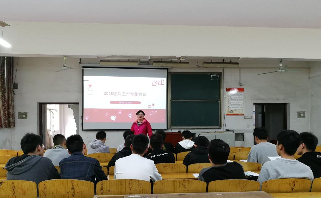 会上,杜娟老师从征兵入伍条件、复学升学政策、就业创业优惠政策、征兵入伍选拔培养、征兵报名程序等方面对2018年大学生征兵相关政策做出了宣传讲解,要求各班落实会议内容,并鼓励浪live