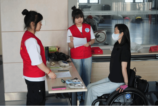 下午,志愿者们协助医生和教练员对营员进行了专项身体测评。在服务过程中,志愿者们主动和教练员、营员进行沟通,了解他们的生活方式和习惯,通过交流互动更好地理解脊髓损伤者的感受与需求,与其建立起信任和亲近,进一步促进残健互融。